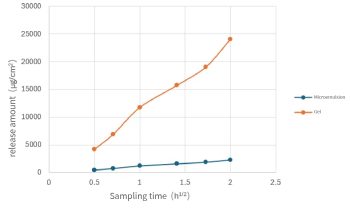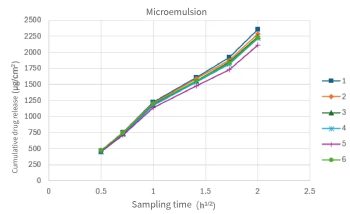 Figure 1. Investigation on the differences in drug release caused by different dosage forms The release rate of the drug in the sample is expressed by the cumulative drug release amount (μg/cm ²) and the square root of time (t) (i.e., Higuch's formula: M=kt1/2), where the k value represents the drug release rate. The results are shown in Figure 1. The release amount of active ingredient was different in different dosage forms, and the gel formulation group had a higher release amount in all sampling points. In addition to the Dosage of drug release, the drug release rate can also reflect the effect of different preparations on the release of the same active ingredient. The drug release rate of the gel is 12711, and that of the microemulsion is 1139.5