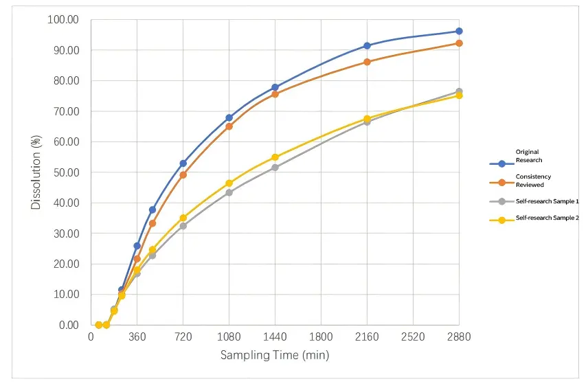 ✔ The two batches of self-researched samples, although with good batch-to-batch consistency, both showed significant differences from the original and the over-rated product: the dissolution rate was significantly slower than that of the original drug 240 min after the start of the experiment, and the final dissolution was only about 76%, which was much lower than that of the original drug (96.23%) and the over-rated product (92.26%).